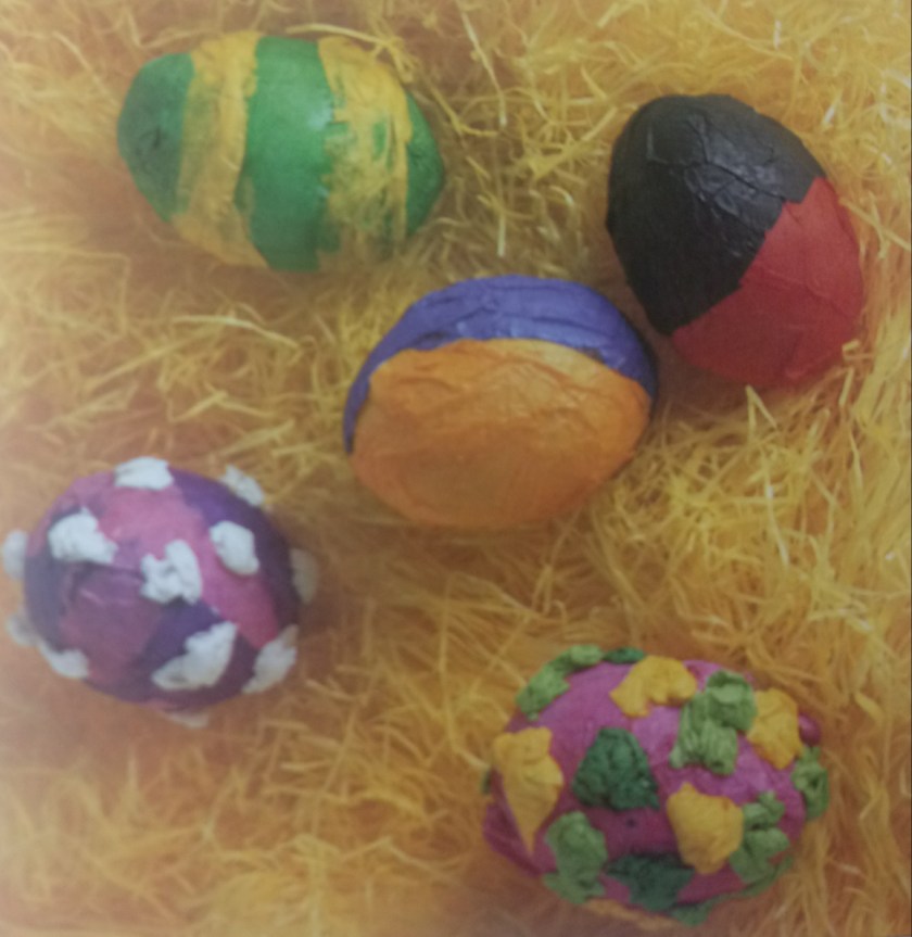 - Ritagliare tanti quadrati di carta velina di circa 8 cm di lato. Accartocciarli per fare delle palline. Incollarle sulle uova. Far asciugare.