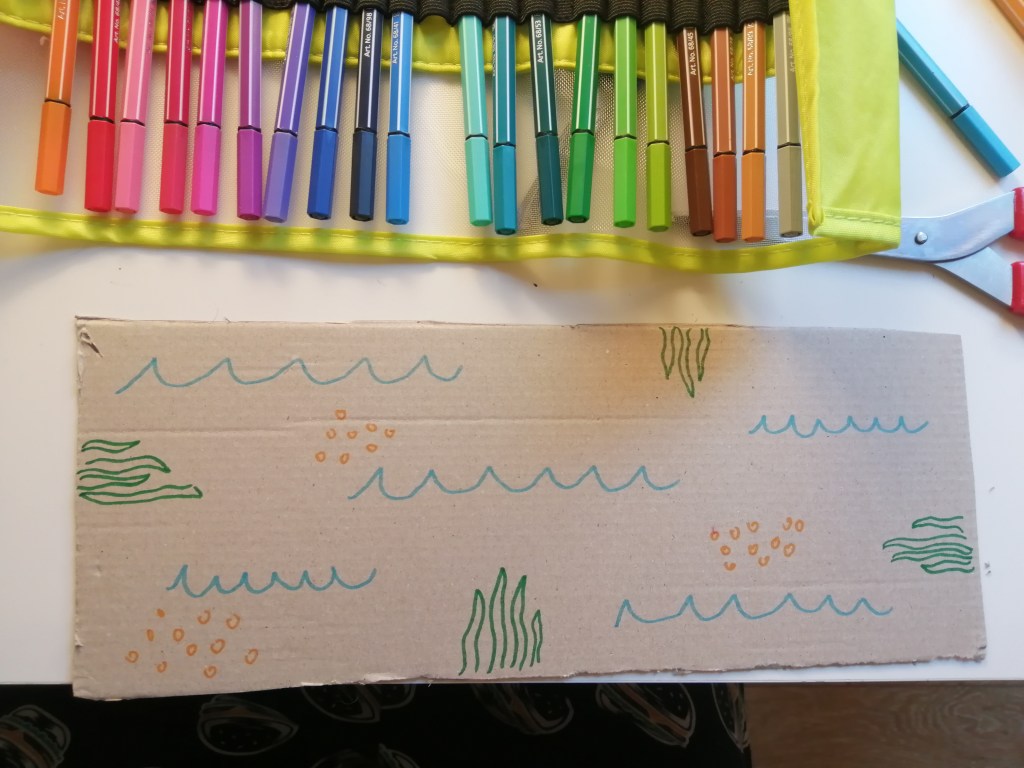 A questo punto usate i colori (abbiamo usato dei pennarelli ma potete usare anche colori a cera o matite, quel che avete o che più vi piace!) per disegnare il vostro fondale marino, quindi fate le onde, la sabbia (sparsa per il foglio o solo sul fondo) e qualche alga lungo il profilo! Consigliamo di lasciare qualche spazio vuoto per dare lo spazio ai personaggi che popolano il nostro fondale!