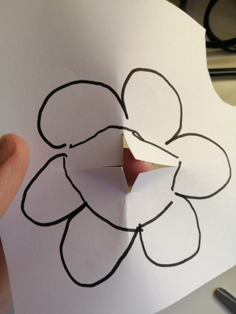 Ora piegate il fiore in un verso, fate un taglio con le forbici, poi piegate dall’altro e fate la stessa cosa, in modo da avere un foro al centro del fiore con delle linguette
