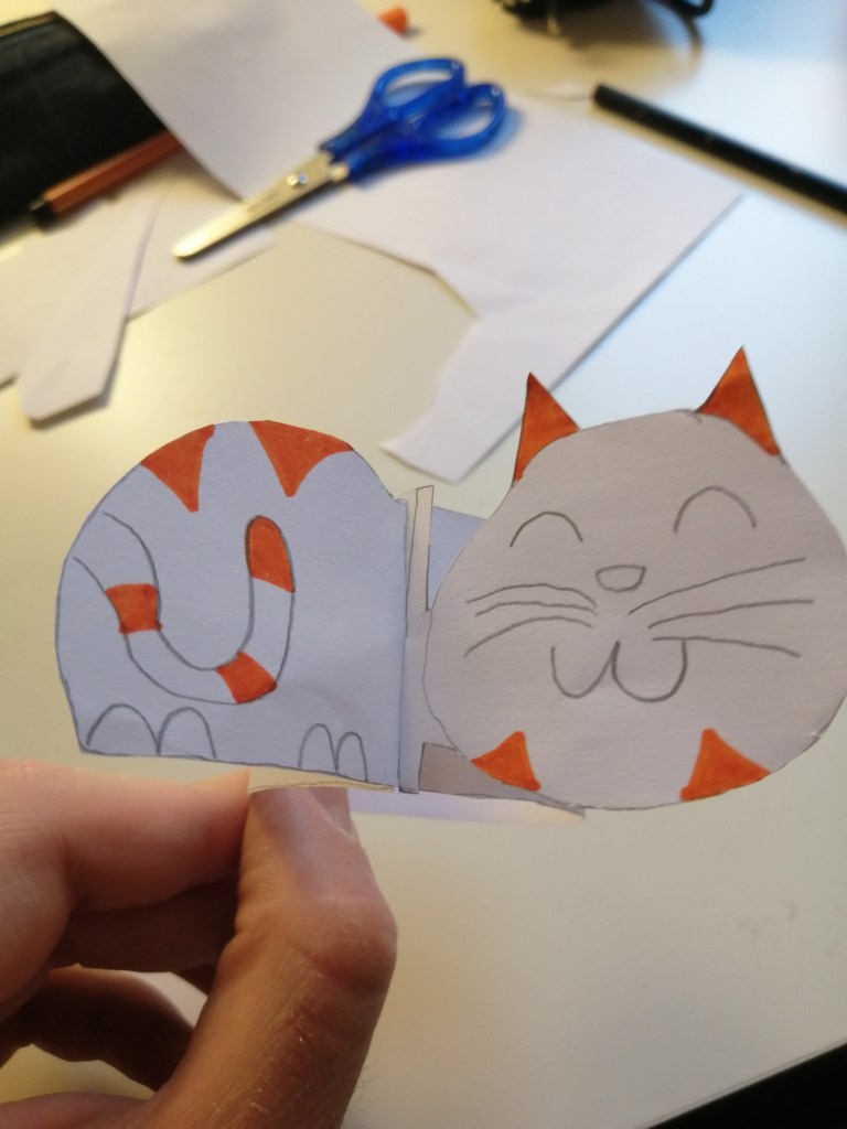 Ora dall’altra parte (se avete ancora spazio), potete fare il corpo, oppure disegnare un gioco per il gatto! Una volta finito, colorate il tutto con dei bei colori; dopo aver colorato, tracciate due linee lungo tutto il foglio per unire sopra e sotto le due figure disegnate; poi potete ritagliare il braccialetto!