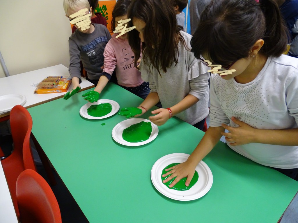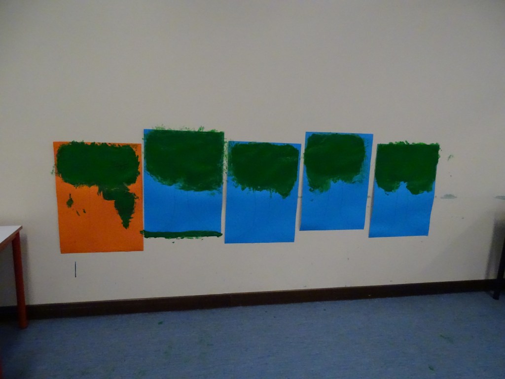Dopo la rappresentazione, le ragazze di Ludovarth hanno invitato i bambini a decorare dei cartelloni. Con la tempera verde i bambini hanno creato la chioma degli alberi lasciando la loro impronta sul foglio. Hanno poi decorato con palline di carta crespa e hanno infine colorato la corteccia e scritto il proprio nome.