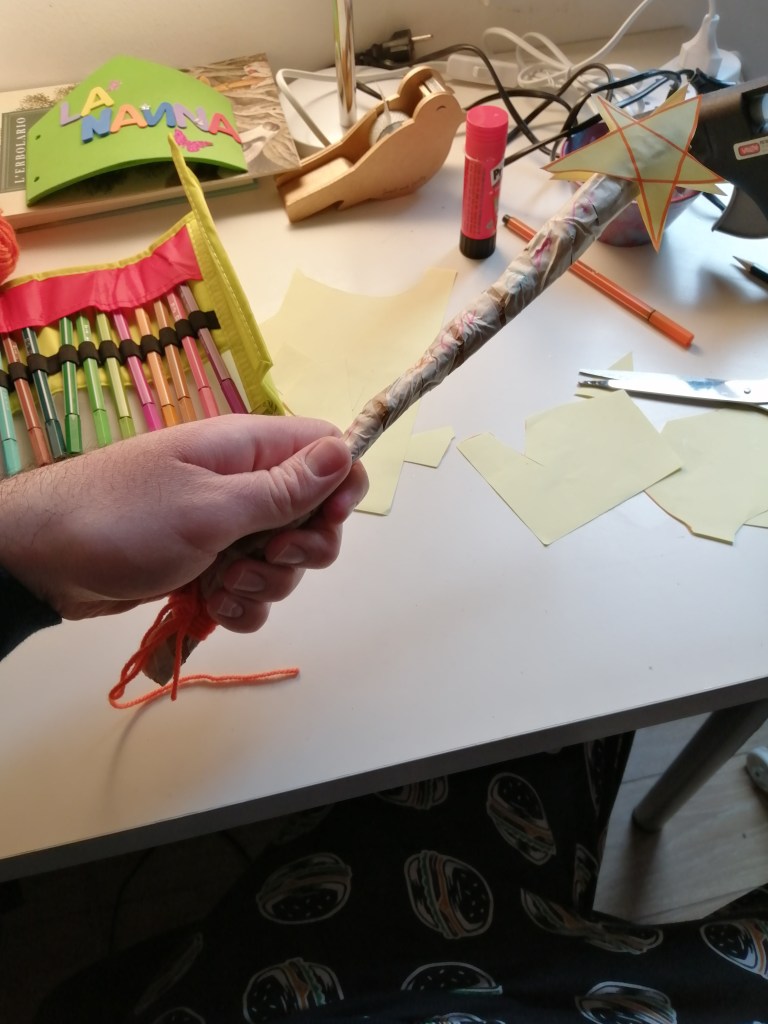 Per ultima cosa, disegnate, ritagliate incollate una stella da un capo della bacchetta, dall’altro annodate il filo o il nastro colorato.